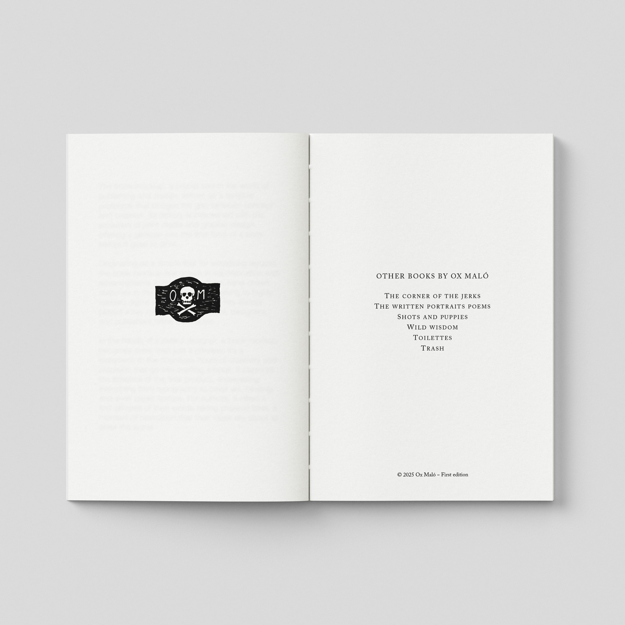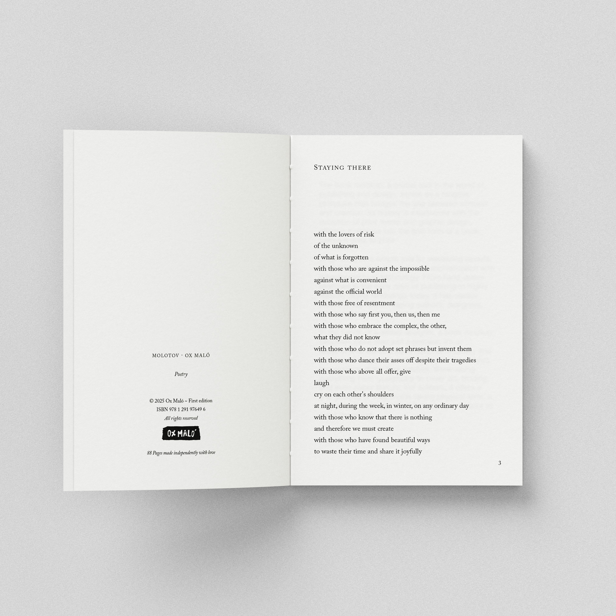 Molotov!, Poetry. ISBN 978 1 291 97649 6, © 2023, 5.83 x 8.27 in / 148 mm x 210 mm, English, First edition, 88 pages made independently with love – PAPERBACK